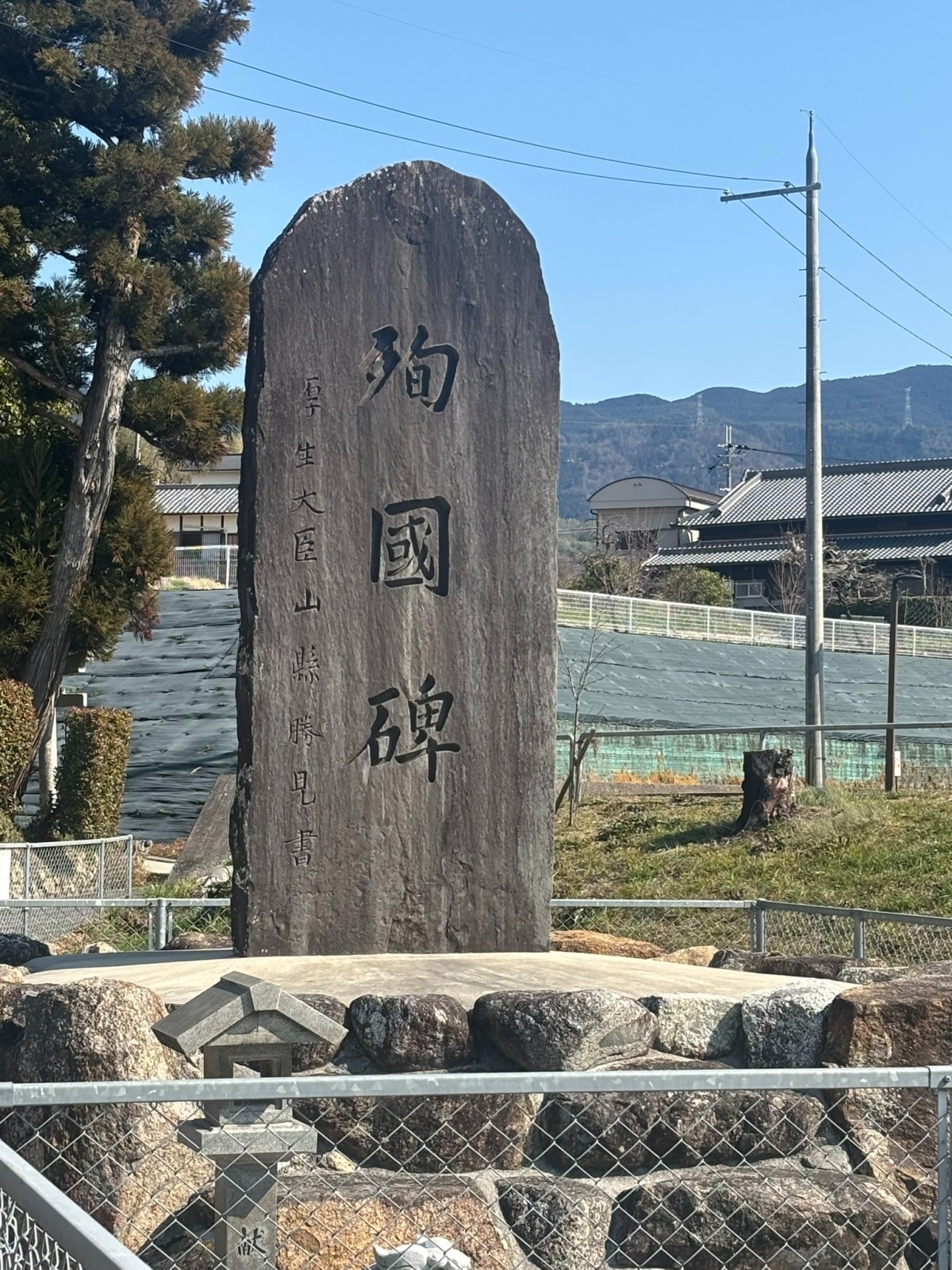 殉国碑です。これは過去の戦争で亡くなった方々の霊を慰めるための碑ですが、それだけでなく、戦争の悲劇を伝承する目的があります。ようするに戦争を二度と繰り返さないという戒めや警告の意味です。その左横にある厚生大臣山縣勝見(やまがた かつみ)とは、昭和時代の政治家で1952年10月から1954年12月まで厚生大臣を務めた人です。