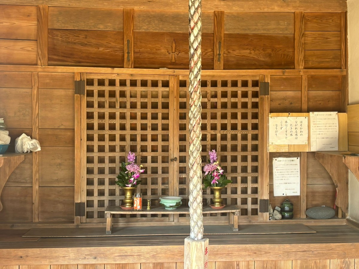 ちょうど御瀧不動尊より一段高い場所にあがると、狛犬や石灯籠が並んでいることから、右側にかつて神社の社殿があってそこに神様が祀られていたことを想像できるように配置されています。