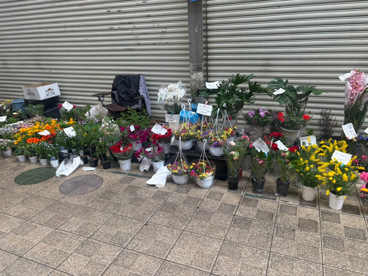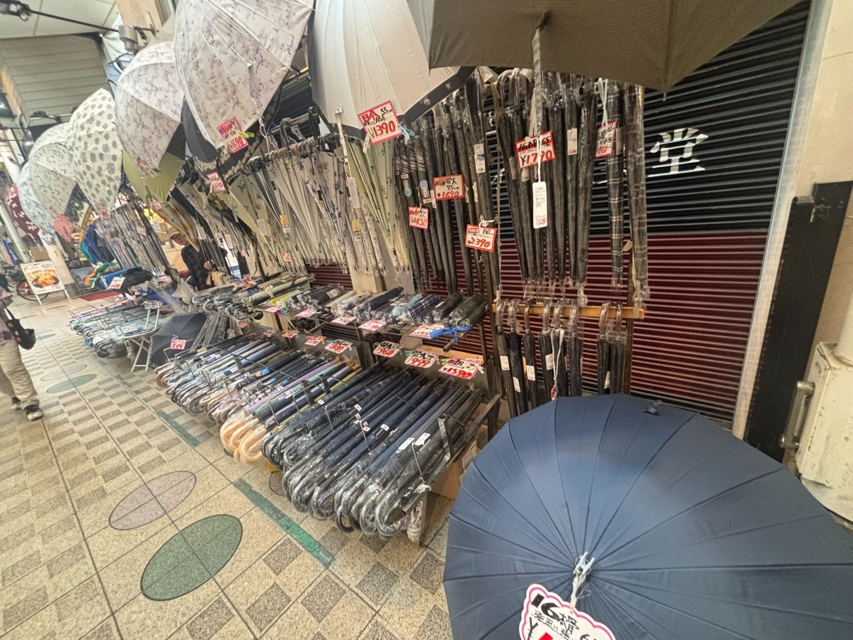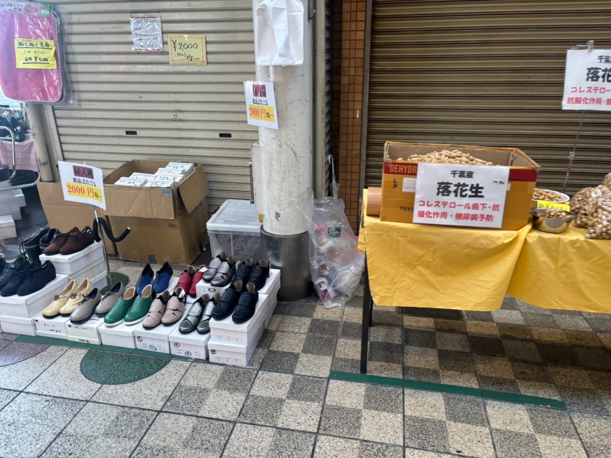 他にも傘の販売など、シャッターの前で販売しているのを見ながら歩きます。商店街全体が活気と楽しい雰囲気に満ちています。