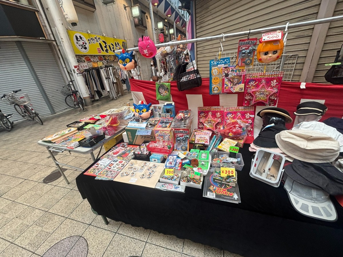 そして野菜だけではありません。縁日で売っていそうなおもちゃやお面などを販売。その横では帽子を販売していました。