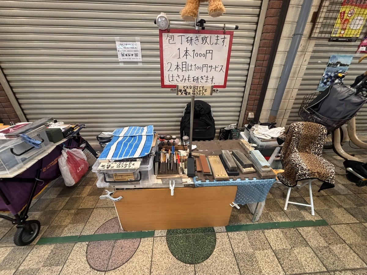 珍しいものを見つけました。ちょうどお昼時で席を外されていた時に撮影。包丁研ぎのお店がシャッターでとじていた店の前で営業していました。